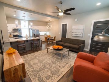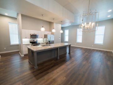 This unit offers a full-sized laundry room, office nook, huge island, very tall ceilings, and a view of the downtown square.